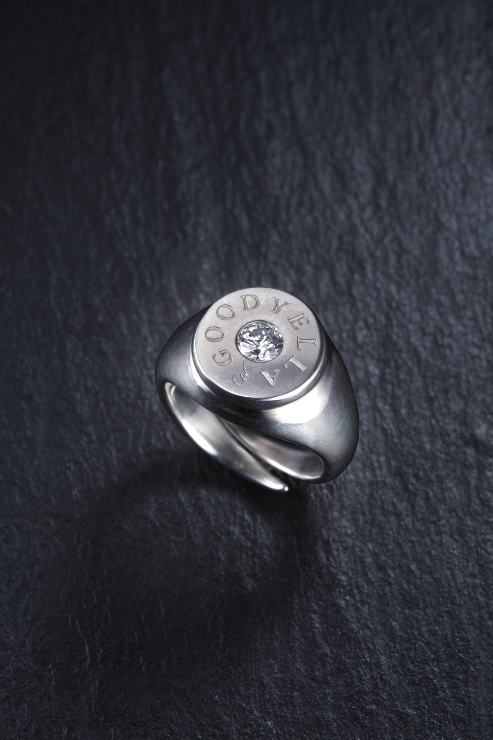 リング中央にジルコニアを埋め込み、周りをGOOD¥ELLAの刻印で囲ったピンキーリング